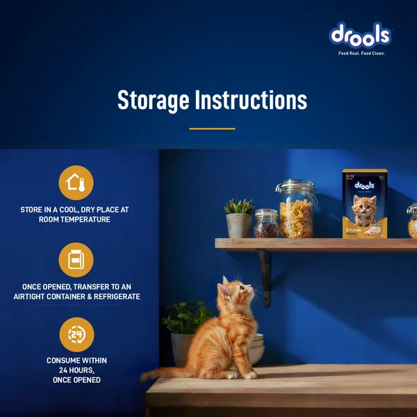 Drools Chicken Mousse is a soft, protein rich wet food specially crafted to support healthy growth and development in kittens. Made with real chicken, hydrolysed liver, and vital nutrients, it promotes strong immunity, optimal digestion, and healthy bone development. Enriched with taurine to support vision and heart health, its smooth texture is easy to lick and digest for young kittens. Free from artificial colors and preservatives, Drools Chicken Mousse ensures complete nutrition for a strong, active, and happy kitten.