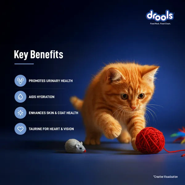 Drools Ocean Fish Mousse is a soft, protein rich wet food specially crafted to support the unique nutritional needs of growing kittens. Made with real tuna, mackerel, and chicken, it delivers high quality animal proteins essential for healthy growth and muscle development. Enriched with pumpkin to support digestion and natural antioxidants like vitamins E and C, it helps build a strong immune system. Its smooth, easy to lick texture is gentle on young tummies, making it perfect for your kitten’s active and developing lifestyle.