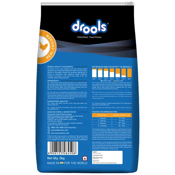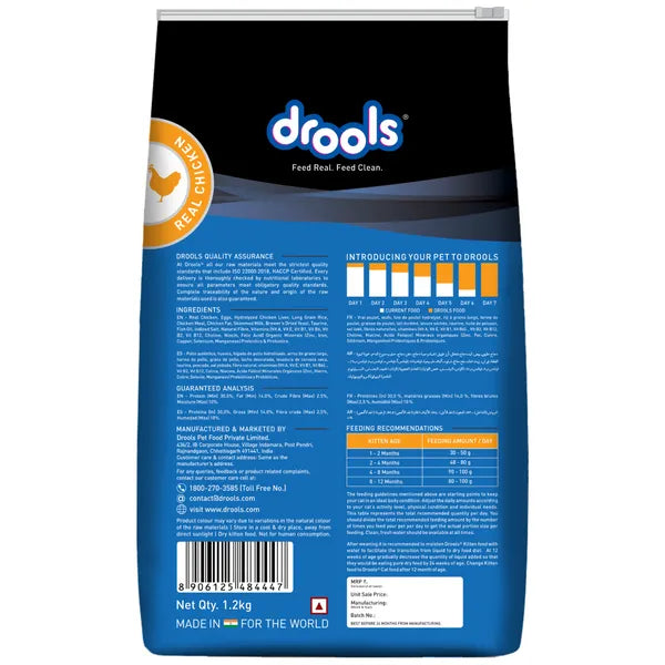 Give your growing kitten the best start with Drools Real Chicken Kitten Dry Food. Specially formulated to meet the nutritional needs of young cats, this premium kitten food features real chicken as its primary ingredient, ensuring a high-quality protein source for optimal growth and development. Enriched with essential nutrients, vitamins, and minerals, it supports your kitten's overall health, providing a tasty and balanced diet that promotes healthy growth and strong immune defence.