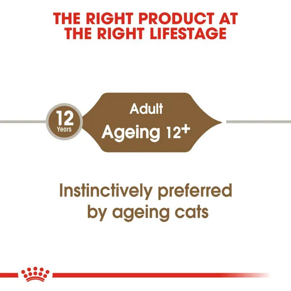 To ensure that your senior cat (aged 12 or over) receives the specific nutrition it needs to help maintain optimal health, you will need to feed it a diet that it will prefer naturally and instinctively.That's why ROYAL CANIN® Ageing 12+ in Gravy is formulated to match the optimal Macro Nutritional Profile that is instinctively preferred by ageing cats like yours.Senior cats will often need higher levels of nutritional support for the overall maintenance of good joint health. This is why ROYAL CANIN® Ageing 12+ in Gravy is specially formulated to help maintain healthy joints through a high level of Omega-3 fatty acids – specifically EPA and DHA.To help support healthy kidney function and overall renal health, ROYAL CANIN® Ageing 12+ in Gravy also contains an adapted phosphorus content.To cater to each cat's individual preferences, ROYAL CANIN® Ageing 12+ is also available in a succulent jelly, or as dry food with tasty and crunchy kibble.If you're considering mixed feeding, simply follow our feeding guidelines to ensure your cat gets an accurate amount of both wet and dry food for optimal benefit.