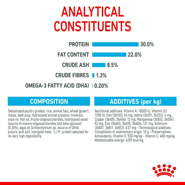 Dehydrated poultry protein, rice, animal fats, vegetable protein isolate*, maize, beet pulp, hydrolysed animal proteins, minerals, fish oil, soya oil, fructo-oligo-saccharides, hydrolysed yeast (source of manno-oligo-saccharides), fatty acid salt, yeast extracts (source of betaglucans), marigold extract (source of lutein).